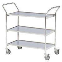 Table roulante avec finition chromé, 3 plateaux 1000x420 mm et 2 poignées de conduite.