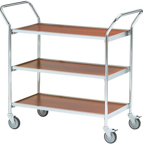 Table roulante avec finition chromé, 3 plateaux 1000x420 mm et 2 poignées de conduite.