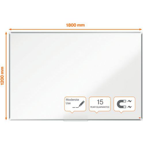 Tableau en acier laqué Premium Plus. Surface en acier laqué magnétique avec cadre moderne en aluminium. Un grand auget qui permet de ranger facilement les marqueurs, les effaceurs ou autres accessoires pour tableau blanc. Bon niveau d'effaçabilité pour une utlisation fréquente. Certifié EU EcoLabel, ce produit garantit un impact environnemental réduit à chaque étape de son cycle de vie, tout en répondant à des critères stricts de qualité et de durabilité. Magnétique
