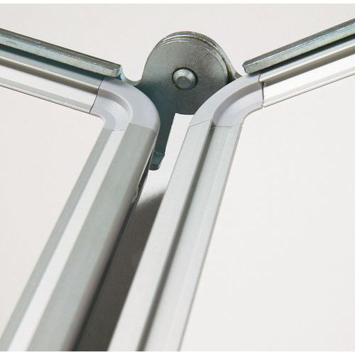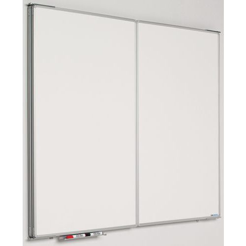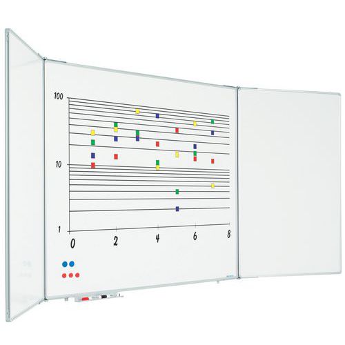 Tableau blanc doté de 5 faces inscriptibles en acier émaillé blanc. Vantaux supplémentaires pour élargir la zone d’écriture. Aimanté et effaçable à sec. Le tableau intermédiaire dispose d’un renfort supplémentaire par la présence d’une plaque arrière en acier galvanisé. Il est également pourvu d’une gouttière destinée à accueillir du matériel. Dimensions ouvert : 90 x 240 et 120 x 400 cm.
