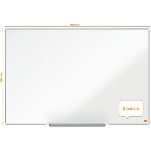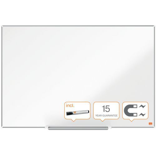 Tableau blanc acier laqué Impression Pro. Surface magnétique de qualité supérieure avec un niveau d'effaçabilité supérieur pour une utilisation fréquente. Cadre fin, moderne et élégant maximisant la surface d'écriture sur le tableau blanc. Système InvisaMount™ facilitant le montage avec des fixations soigneusement dissimulées derrière le tableau blanc. Un auget design pour ranger vos marqueurs et effaceurs. Magnétique