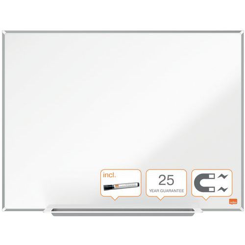 Tableau blanc émaillé Impression Pro. Surface magnétique émaillée, avec un niveau d'effaçabilité supérieur pour une utilisation fréquente. Cadre fin, moderne et élégant maximisant la surface d'écriture sur le tableau blanc. Un auget design pour ranger vos marqueurs et effaceurs. Système InvisaMount™ facilitant le montage avec des fixations soigneusement dissimulées derrière le tableau blanc. Magnétique