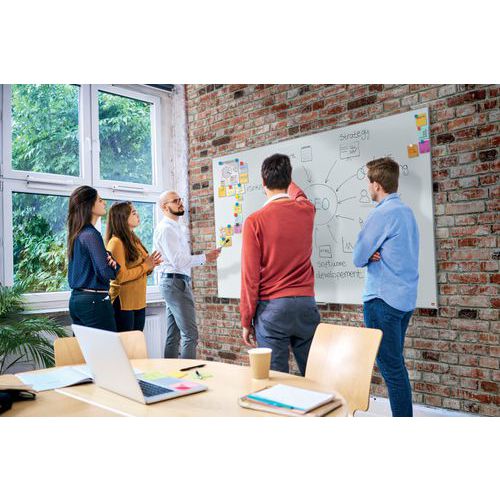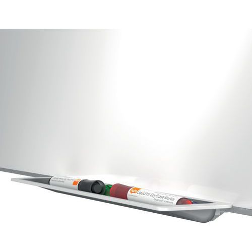 Tableau blanc émaillé Impression Pro. Surface magnétique émaillée, avec un niveau d'effaçabilité supérieur pour une utilisation fréquente. Cadre fin, moderne et élégant maximisant la surface d'écriture sur le tableau blanc. Un auget design pour ranger vos marqueurs et effaceurs. Système InvisaMount™ facilitant le montage avec des fixations soigneusement dissimulées derrière le tableau blanc.