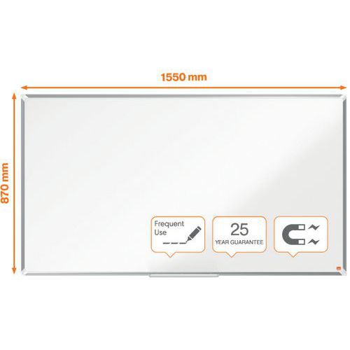 Tableau blanc émaillé Premium Plus. Surface magnétique émaillé offrant un niveau d'effaçabilité et de durabilité optimal. Cadre moderne et élégant en aluminium. Grand auget permettant de ranger facilement les marqueurs et les effaceurs. Certifié EU EcoLabel, ce produit garantit un impact environnemental réduit à chaque étape de son cycle de vie, tout en répondant à des critères stricts de qualité et de durabilité.