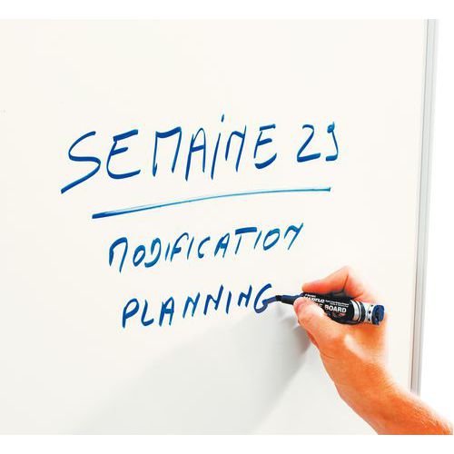 Tableau blanc émaillé magnétique, effaçable à sec. Excellente lisibilité grâce à un meilleur contraste des couleurs. Tableau blanc émaillé conçu pour une utilisation intensive. Avec goulotte clipsable pour accueillir des accessoires. Pour usage intensif, à utiliser sans modération !