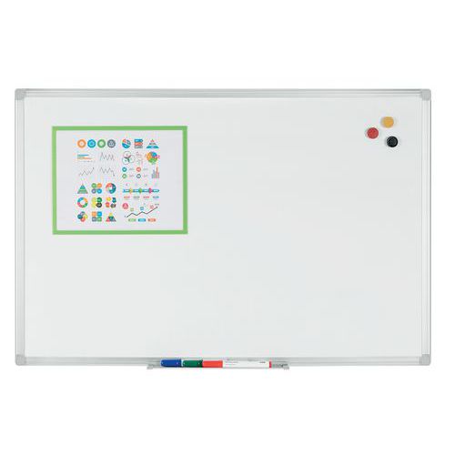 Tableau blanc aimanté laqué de haute qualité. Grand confort d'écriture via surface en acier laqué. Dos du tableau softboard. Peut être utilisé pour écrire ou pour afficher grâce au revêtement magnétique. Résistant et élégant via cadre en aluminium. Pratique grâce à sa goulotte de rangement inclus. Facilement effaçable à sec. Fixation murale simple et rapide. 4 perçages arrière aux 4 angles (diamètre 3.5 mm). Trous de fixation cachés par cache-vis plastique. Garantie client : 10 ans Magnétique