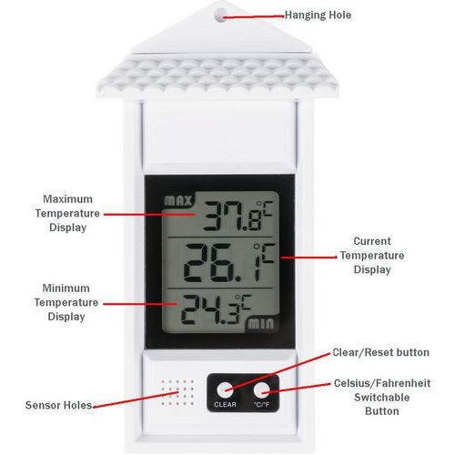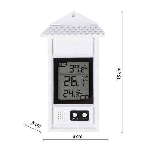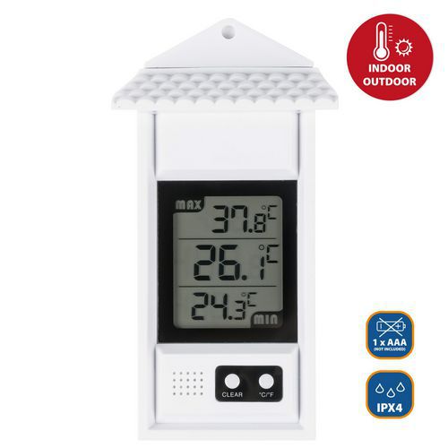 | Intitulé du produit | Thermomètre numérique intérieur/extérieur, Température mesurée maxi: 50 °C, Pile fournie: non |