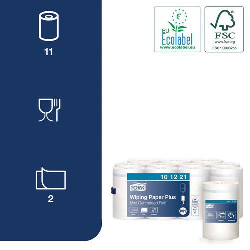 Mini bobine d'essuyage Tork Plus M1 multi-usages. Emballage ergonomique en carton facile à transporter, à ouvrir et à jeter. Essuie-mains à absorption élevée résistant à l'humidité. Séchage hygiénique des mains avec sensation agréable au toucher.