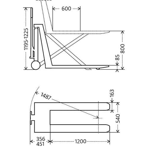 - Si la hauteur de levage est supérieure à 400 mm, le transpalette est immobilisé automatiquement grace aux stabilisateurs.