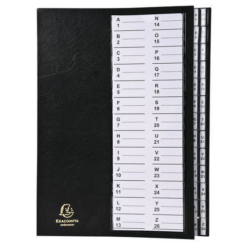 | Intitulé du produit | Trieur à onglets cavaliers 26 compartiments Alphanumériques, Nb de divisions: 26, Coloris: Noir |