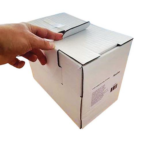 Logement boucles et dévidage dessus ou côté de boîte. Serrage du feuillard effectué par une tension manuelle. Maintien cerclage bien assuré par boucle autobloquante. Solution simple et économique, pratique, prête à l'usage. Garantie client : 10 ans