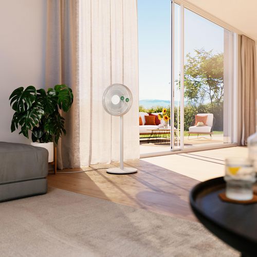 Le ventilateur sur pied Finn assure une fraîcheur agréable pendant les journées chaudes grâce à sa fonction oscillante et à sa technologie à haute efficacité énergétique.