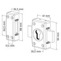 | Intitulé du produit | Verrou basique pour cylindre Européen, Coffre largeur: 61 mm, Coffre hauteur: 90 mm, Gâche largeur: 36.5 mm |