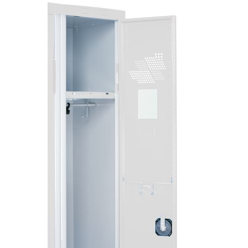 Vestiaire en tôle d'acier 1er choix, de belle rigidité, indéformable. Tôle d'acier 6/1e profilée (équivaut à pliage standard 8/1e). Excellente résistance mécanique avec profil fermé agrafé. Porte indégondable ouverte ou fermée, antieffraction. Articulation sur charnières avec ouverture à 18°. Armoire vestiaire avec porte-étiquette embouti. Alliez résistance, sécurité, esthétique pour vos espaces collectifs !