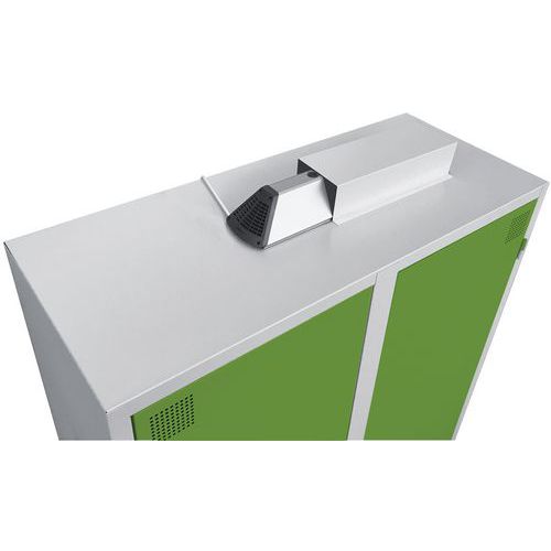 Vestiaire de désinfection rapide, efficace et économique avec technologie Ozone. Tablette largement perforée pour libre circulation et bonne ventilation de l’Ozone. Vestiaire avec capot de protection ainsi que témoin de fonctionnement d'Air Care. Produit conçu et fabriqué en France. Solution Ozone : désinfection totale en temps record des vêtements et outils !