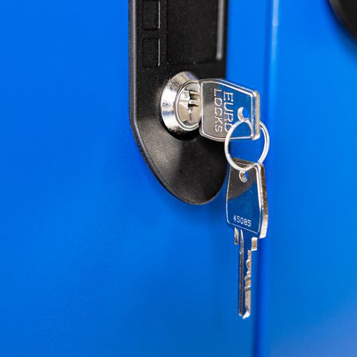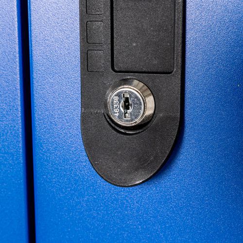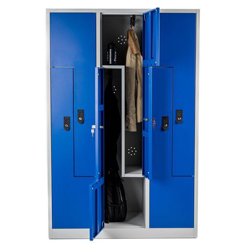 Vestiaire de collectivités en acier au design sobre et épuré. Gain de place avec 2 vestiaires par colonne distribués en L. Chaque vestiaire comprend une penderie et un casier. Penderie complète munie d'une tringle et d'un crochet.