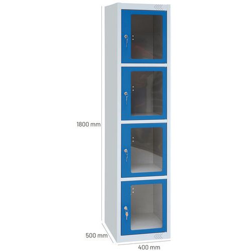 | Intitulé du produit | Vestiaire porte transparente 4 cases, Type de vestiaire: À casiers, Matériau: Acier, Nb de cases/colonne: 4 |