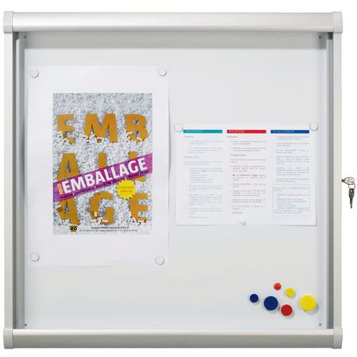 Vitrine d'affichage intérieur avec cadre en aluminium anodisé naturel pour un aspect moderne. Pratique, son fond métal magnétique permet l'affichage par plots aimantés ou une écriture effaçable à sec. Porte battante pratique et verrouillable pour une sécurité maximale avec possiblité de montage de l'ouverture vers la droite ou vers la gauche. Afficher vos informations en toute sécurité grâce à sa porte en verre Securit.