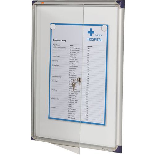 Vitrine d'intérieur extra plate à fond magnétique de 22 mm d'épaisseur. Vitrine d´affichage trouvant sa place dans les couloirs et lieux de travail très fréquentés. Fond métal blanc pour fixer des notes à l´aide d´aimants ou inscrire des messages avec des marqueurs effaçables à sec. Façade en acrylique équipée d´une serrure livrée avec 2 clés. Kit de fixation murale fourni. Garantie de 1 an.